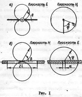 Из рассмотрения приведенных формул следует, что щель, прорезанная в экране, не создает направленного излучения в Е-плоскости и ее диаграмма направленности имеет форму полуокружности с каждой стороны экрана. В Н-плоскости направленность излучения щели определяется формулой (1) и зависит от длины щели.