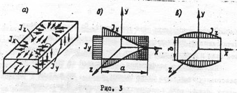 имеет место поперечный ток и продольный ток на широких стенках волновода (рис.3,а). Эпюры распределения токов по поперечному сечению волновода приведены на рис.3,б. Поперечный ток в середине широкой стенки волновода равен нулю и нарастает до своего максимального значения к краям стенок. Распределение продольного тока представлено на рис.3,в.