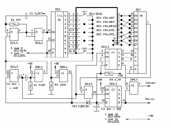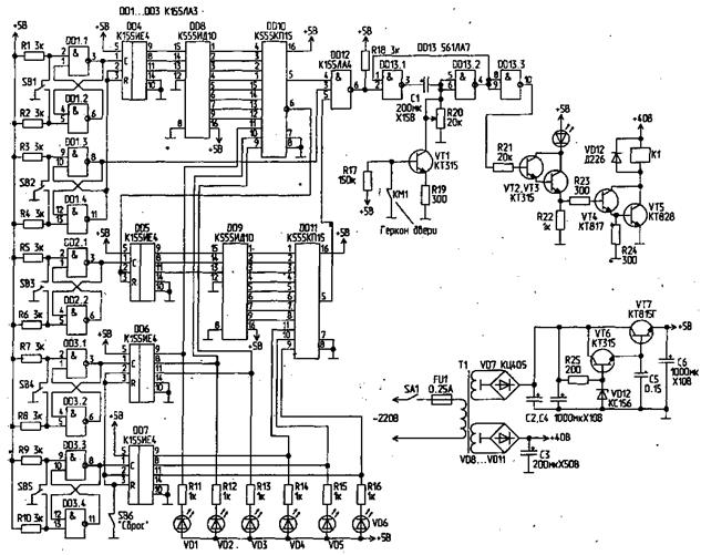 DD2 и входами микросхемы DD4. Секретность замка составляет 108 комбинаций, что выше по сравнению, например с [1]. При необходимости число цифр в коде можно уменьшить до 4, подключив вывод 6 микросхемы DD5 к выводу 13 микросхемы DD3 и вывод 5 к выводу 5, предварительно отключив от цепей использованных ранее. Незадействованные входы микросхемы DD4 должны быть соединены с общим проводом. Естественно, секретность замка в этом случае будет ниже. Сигнальное устройство должно включаться высоким логическим уровнем и работать при исчезновении этого уровня после приведения электронной части замка в исходное состояние. Сброс замка в исходное состояние можно выполнять отдельной клавишей, размещенной вместе с остальными. В этом случае необходимо исключить элементы R4, C3 и VD1, подключив резистор сопротивлением 100 кОм между точкой соединения выводов 7 и 15 микросхемы DD3 и общим проводом и дополнительную клавишу между этой точкой и проводом питания. В этом случае обнуление счетчиков будет производиться этой клавишей. Надежность устройства несколько повысится, если между каждой клавишей и точкой соединения резистора R3 и выводом 12 элемента DD5.2 включить любые кремниевые диоды (например КД521) анодами к клавишам.