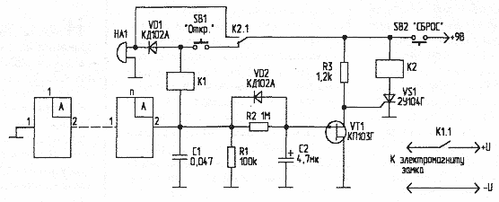 В исходном состоянии сопротивление канала исток-сток полевого транзистора VT1 невелико, управляющий электрод тиристора "закорочен" на общий провод. Если кнопка SB1 "Откр." нажата свыше 5 с, или производятся попытки подбора кода с замыканием кнопки SB1, конденсатор С2 заряжается, транзистор VT1 разблокирует цепь управления тиристором VS1. Тиристор включается, реле К2 (нагрузка тиристора) своими контактами К2.1 размыкает цепь набора кода и включает звуковую (или иную, не показанную на схеме) сигнализацию. Последующие обращения к замку возможны лишь после деблокировки схемы - нажатия кнопки SB2 "Сброс".