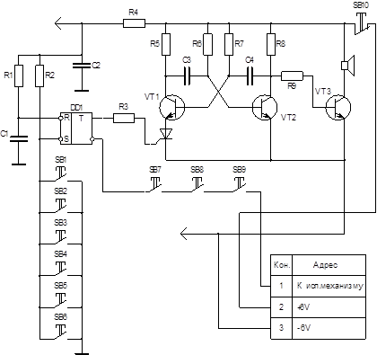 При подаче напряжение питания цепь R1C1 устанавливает триггер DD1 в нулевое состояние и на инверсионном выводе 6 микросхемы DD1 - высокий уровень. При одновременном нажатии кнопок SB7- SB9 с этого вывода поступает сигнал на исполнительное устройство, которое состоит из транзисторного усилителя и тягового соленоида, управляющего ригелем замка.