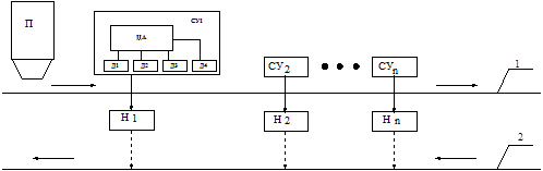 Изготовленные предметы из питателя П поступают на транспортную систему 1 и автоматически распределяются (сортируются) по накопителям Н1 – Нn. Управление осуществляется с помощью сортировочных устройств СУ1 – СУn , измеряющих некоторые параметры предметов и вырабатывающих сигнал управления на складирование в накопитель Н при совпадении набора определенных значений параметров предметов с заданным. При достижении количества отсортированных предметов заданному числу контейнер с отсортированными предметами удаляется с помощью другой транспортной системы 2, обеспечивая непрерывность процесса.