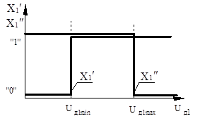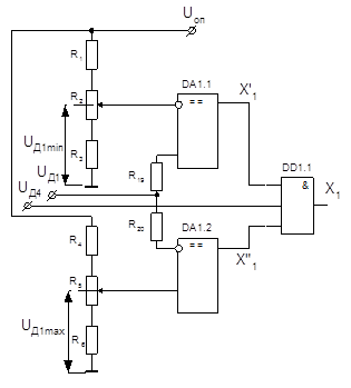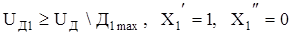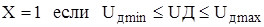 Числовая оценка параметра признака осуществляется в цифровой форме. Данный признак Х принимает единичное значение, если выходное напряжение соответствующего аналогового датчика находится в определенной зоне, задаваемой двумя пороговыми значениями UД min и UД max :