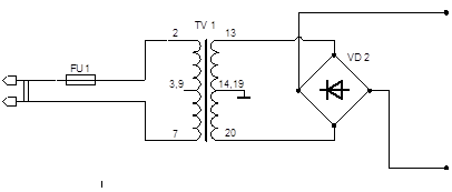 Для выпрямления полученного напряжения на вторичных обмотках трансформатора TV применим мостовую схему выпрямителя с выводом нулевой точки трансформатора (рисунок 16), необходимого при реализации получения двух разнополярных относительно нулевой точки напряжений.
