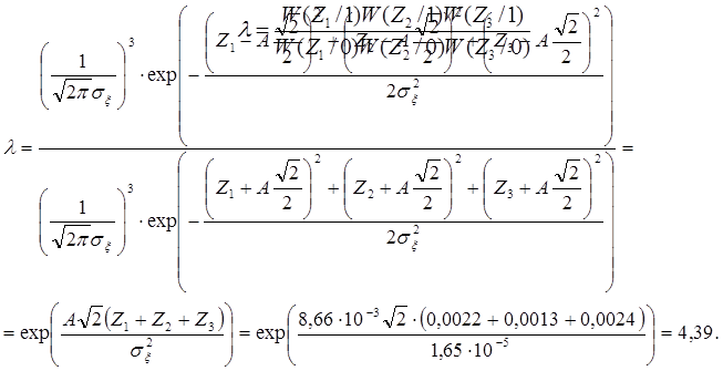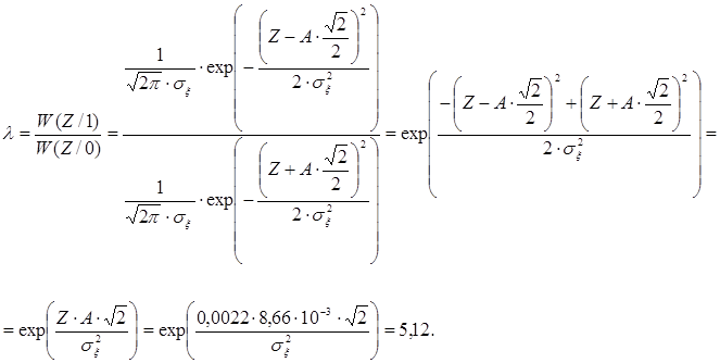 Определим, какой символ будет зарегистрирован на приеме при условии, что решение о переданном символе принимается по совокупности трех независимых некоррелированных отсчетов Z1 = Z( t1 ), Z2 = Z( t2 ), Z3 = Z( t3 ) на длительности элемента сигнала Т , имеющих следующие значения: Z1 = 0,0022; Z2 = 0,0013; Z3 = 0,0024. Для принятия решения воспользуемся отношением правдоподобия, сравнив его с пороговым отношением.