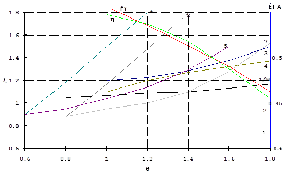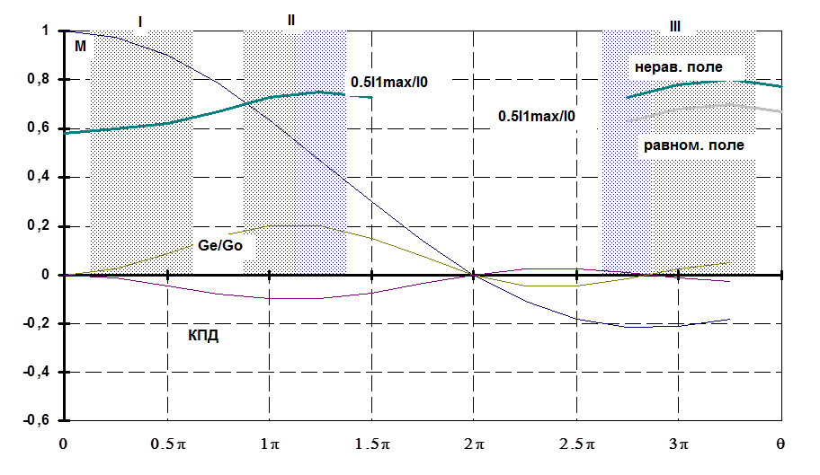 Рис.1. Зависимости электронного тока, коэффициента взаимодействия и электронной провидимости и КПД от угла пролета.