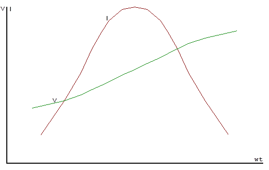 Также, сгруппированный поток можно характеризовать распределением тока I и скоростей электронов v внутри потока рис.2.2. Эта методика будет учитывать не только степень группирования электронов, но и скоростное распределение электронов в потоке. Это обстоятельство очень важно, так как эффективность торможения электронов в выходном зазоре лучше, если сначала идут медленные электроны, а затем быстрые. Такое распределение позволяет равномерно затормозить электроны без выбрасывания части электронов назад.