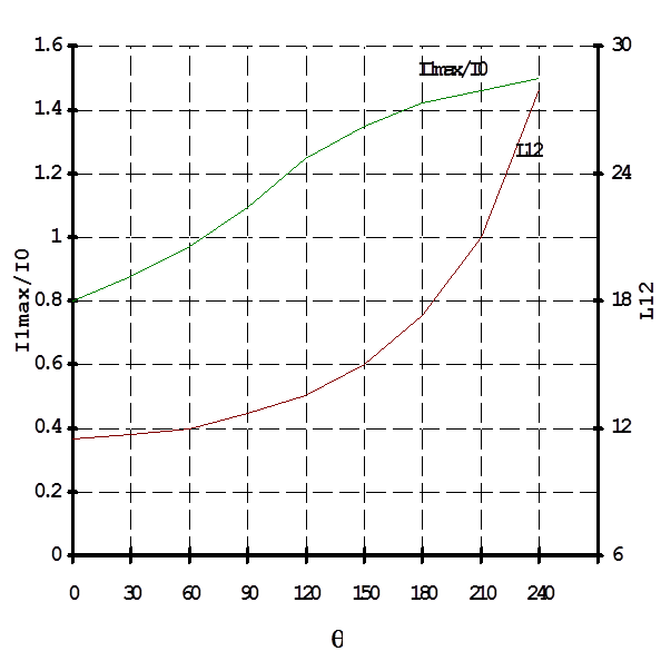 Результаты исследований по рассматриваемой теме приводит в своей книге А.З.Хайков [5]. Он пишет, что используя достаточно протяженный зазор входного резонатора и большое напряжение на нем, можно добиться увеличения I1max /I0 по сравнению со значением, характерным для узких зазоров. Практически такую возможность повышения КПД целесообразно использовать в двухрезонаторных клистронах-автогенераторах, так как в усилителе на двухрезонаторном клистроне подобный режим привел бы наряду с ростом КПД к резкому уменьшению усиления . Графики на рис.2.5 показывают как изменяется величина максимальной относительной амплитуды первой гармоники тока I1max /I0 и расстояние между центрами зазоров L12 в зависимости от угла пролета во входном зазоре q1 .