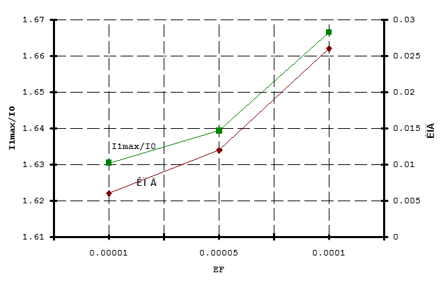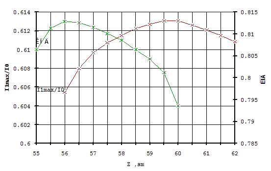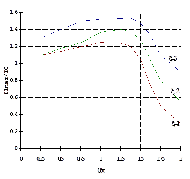 Повышение относительного значения первой гармоники электрического тока I1max /I0 при времени пролета равным или большем половины периода отмечено в работе [3]. Когда время пролета через зазор равно или больше половины периода, скоростная модуляция становится несинусоидальной.