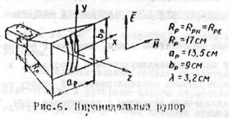 Рупорная антенна (рис.6) состоит из рупора - отрезка волновода плавно расширяющегося сечения с открытым излучающим концом - раскрывом и устройства для питания рупора - волновода с возбуждающим устройством.