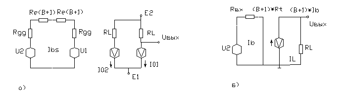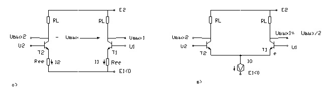 Пара (рис 1а) осуществляет, таким образом, вычитание сигналов на выходах усилителей; разность DUвых (формулы 2, 8) наблюдается между коллекторными выходами транзисторов Т2 и Т1.