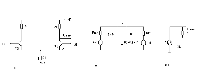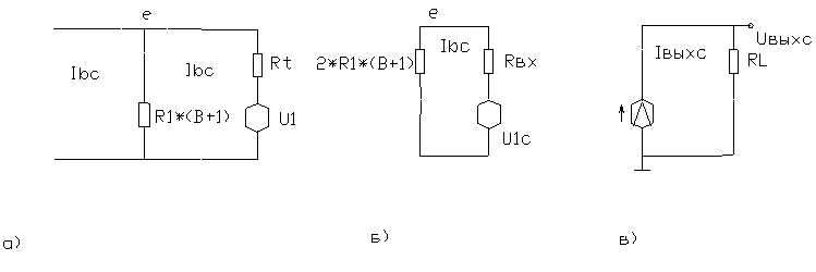 Рис. 4 Появление синфазного сигнала при неидеалоьном источнике тока в эмиттерных ДК: а) резистор R1, подключенный к точке е, заменил источник тока; б) модель входной цепи; в) модель выходной цепи