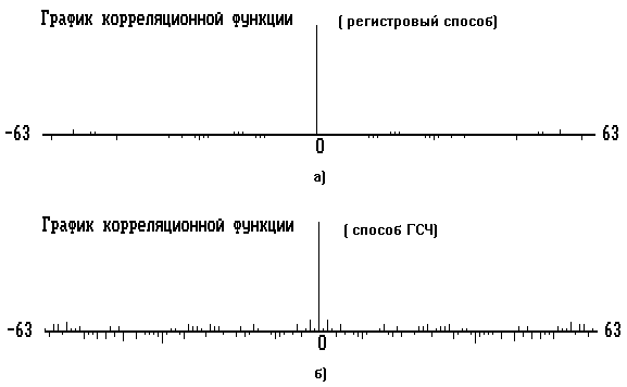 О лучших случайных характеристиках можно также судить по графикам АКФ(рисунок 2) : квазислучайная последовательность полученная регистровым способом обладает лучшими корреляционными свойствами (малый размер боковых лепестков, большая удаленность максимального из боковых от нулевого).
