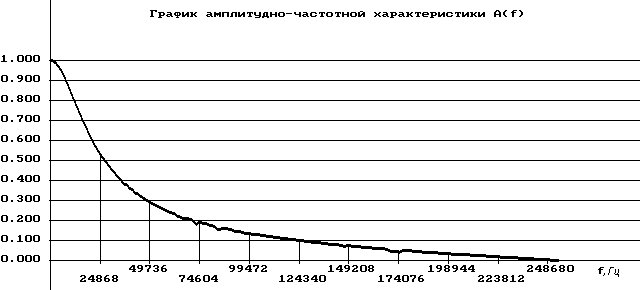 | АЧХ A(f) | 1 | 0,52968 | 0,29273 | 0,19037 | 0,13361 | 0,03469 | 0,0001 |