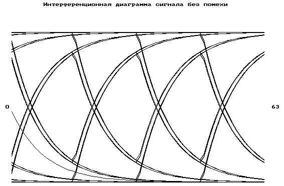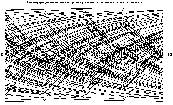 Для устойчивого приема сигнала необходимо, чтобы интерференционные искажения сигнала в линии не превышали допустимого значения на данной скорости передачи. С помощью программы «Skrivlen» определим величину интерференционных искажений. Для этого приведем на рисунке 10 интерференционную диаграмму сигнала (расчет ведем для длины линии 5 км, диаметра кабеля 0,4 мм, отношение сигнал/шум - 10 Дб и скорости передачи сигнала 17188 Бод - такая эффективная полоса СПМ сигнала):