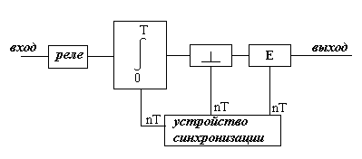 Реле выполняет роль порогового элемента, а устройство синхронизации, выделяя длительность импульса из поступающих сигналов, управляет интегратором (обнуление в конце каждого такта), импульсным элементом (замер выходного значения интегратора в конце каждого такта) и экстраполятором.На выход поступают двухполярные сигналы, практически соответствующие выходным передатчика (при заданном соотношении сигнал/помеха и учете что помеха - гауссовский шум).