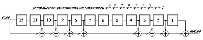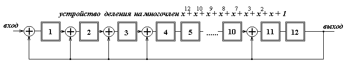 Формирователем циклического кода может выступать устройство умножения на порождающим многочлен g(x) = x12 +x10 +x9 +x8 +x7 +x3 +x2 +x+1. Такое устройство, реализуемое на триггерах и двоичных сумматорах, приведено на рисунке 15.