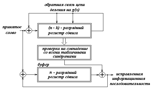 В таком декодере, принятое слово, поступает в буфер, выходными значениями которого управляет блок проверки совпадений ошибок с табличными синдромами. В результате обнаружения ошибки (точнее нахождению в таблице синдрома, соответствующего остатку от деления принятого слова на порождающий полином), кодер исправляет соответствующий разряд, когда тот выталкивается из буфера - n-разрядного регистра сдвига.