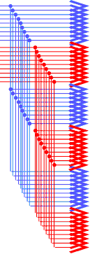 Рассмотрим также принцип коммутации разноименных временных каналов, он сводится к перестановке импульсов из одной временной позиции в другую (или в общем случае сдвигу). Технически эта перестановка осуществляется с помощью записи последовательности битов в оперативное запоминающее устройство (ОЗУ) подряд, а в следующем цикле считывании ее в порядке соответствующем требуемой коммутации. Запись информации производится последовательно (есть адреса, по которым производится запись, генерируются счетчиком тактовых импульсов), а чтение – выборочно (то есть в соответствии с адресами, считываемыми из управляющего запоминающего устройства (УЗУ)).