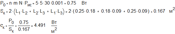 SИС i - суммарная площадь поверхностей i-й микросхемs, в нашем случае для всех одинаковая и равна SИС i = 2 (с1 × с2 + с1 × с3 + с2 × с3 ) = 2 (19.5×6 + 19.5×4 + 6×4) = 438 мм2 = 0.000438 м2 ;