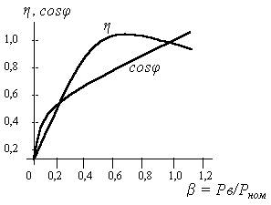 Из графика видно, что при малых нагрузках cosφ довольно низкий, что является в энергетическом отношении весьма невыгодным.