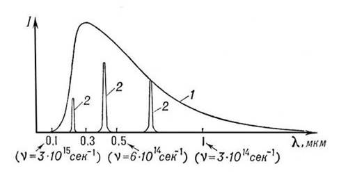Излучение теплового источника, кроме того, немонохроматично, оно заполняет широкий интервал длин волн (рис. 1 ). Например, спектр излучения Солнца захватывает ультрафиолетовый, видимый и инфракрасный диапазоны длин волн. Для повышения монохроматичности излучения применяют монохроматоры, позволяющие выделить из сплошного спектра сравнительно узкую область, или используют газоразрядные источники света низкого давления, дающие дискретные атомные или молекулярные узкие спектральные линии. Интенсивность излучения в спектральных линиях, однако, не может превышать интенсивности излучения абсолютно чёрного тела, температура которого равна температуре возбуждения атомов и молекул (рис. 1 ). Т. о., в обоих случаях монохроматизация излучения достигается ценой громадных потерь энергии. Чем уже спектральная линия, тем меньше излучаемая энергия.