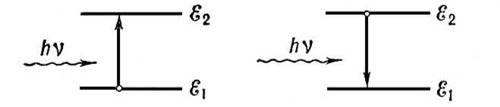 Принцип работы лазера. Возбуждённый атом может самопроизвольно (спонтанно) перейти на один из нижележащих уровней энергии, излучив при этом квант света. Световые волны, излучаемые нагретыми телами, формируются именно в результате таких спонтанных переходов атомов и молекул. Спонтанное излучение различных атомов некогерентно. Однако, помимо спонтанного испускания, существуют излучательные акты др. рода. При распространении в среде световой волны с частотой v, соответствующей разности каких-либо двух энергетических уровней E 1 , E 2 атомов или молекул среды (hn = E2 — E1 , где h — постоянная Планка), к спонтанному испусканию частиц добавляются др. радиационные процессы. Атомы, находящиеся на нижнем энергетическом уровне E 1 , в результате поглощения квантов света с энергией hn переходят на уровень E 2 (рис. 2 , а). Число таких переходов пропорционально r (n ) N1 , где r (n ) — спектральная плотность излучения в эрг/см3 , N 1 — концентрация атомов, находящихся на уровне E 1 (населённость уровня). Атомы, находящиеся на верхнем энергетическом уровне E 2 , под действием квантов hn вынужденно переходят на уровень E 1 (рис. 2 , б). Число таких переходов пропорционально r (n ) N2 , где N 2 — концентрация атомов на уровне E 2 . В результате переходов E1 → E2 волна теряет энергию, ослабляется. В результате же переходов E2 → E1 световая волна усиливается. Результирующее изменение энергии световой волны определяется разностью (N2 — N1 ). В условиях термодинамического равновесия населённость нижнего уровня N1 всегда больше населённости верхнего N2 . Поэтому волна теряет больше энергии, чем приобретает, т. е. имеет место поглощение света. Однако в некоторых специальных случаях оказывается возможным создать такие условия, когда возникает инверсия населённостей уровней E 1 и E 2 , при которой N2 > N1 . При этом вынужденные переходы E2 → E1 преобладают и поставляют в световую волну больше энергии, чем теряется в результате переходов E1 → E2 . Световая волна в этом случае не ослабляется, а усиливается.