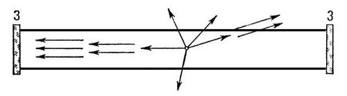 Спонтанное излучение одного из возбуждённых атомов активной среды (т. е. атома, находящегося на уровне E 2 ), прежде чем оно выйдет из объёма V, может вызвать вынужденные переходы др. возбуждённых атомов и вследствие этого усилится (рис. 3 ). Существенно, что усиление зависит от пути, проходимого волной в среде, т. е. от направления. Если поместить активную среду в простейший оптический резонатор, т. е. между двумя параллельными полупрозрачными зеркалами, находящимися на определённом расстоянии друг от друга, как в интерферометре Фабри — Перо (рис. 4 ), то в наиболее благоприятные условия попадает волна, распространяющаяся вдоль оси интерферометра. Усиливаясь, она достигнет зеркала, отразится от него и пойдёт в обратном направлении, продолжая усиливаться, затем отразится от второго зеркала и т.д. При каждом «проходе» интенсивность волны увеличивается в ekL раз, где k — коэффициент усиления в см-1 , L — длина пути волны в активной среде. Если усиление на длине L больше потерь, испытываемых волной при отражении, то с каждым проходом волна будет усиливаться всё больше и больше, пока плотность энергии r (n ) в волне не достигнет некоторого предельного значения. Рост r (n ) прекращается, когда выделяемая в результате вынужденных переходов энергия, пропорциональная r (n ), не может компенсироваться энергией, затрачиваемой на возбуждение атомов. В результате между зеркалами устанавливается стоячая волна, а сквозь полупрозрачные зеркала выходит наружу поток когерентного излучения.