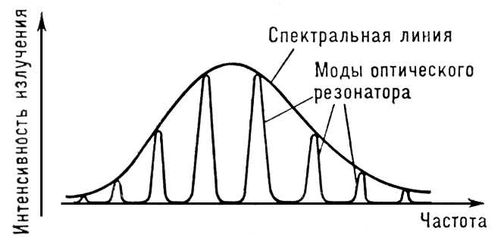 Оптический резонатор накладывает ограничения на спектральный состав излучения. При заданной длине резонатора L в нём возбуждаются волны с частотами