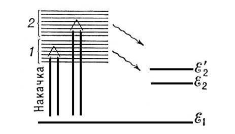 Рис. 7: Уровни активной cреды твердотельного лазера непрерывного действия (схема)