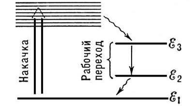 Метод оптической накачки обладает несколькими преимуществами. Во-первых, он применим для возбуждения сред с большой концентрацией частиц (твёрдые тела, жидкости). Во-вторых, этот метод возбуждения весьма селективен. Так, в рубине в основном поглощается только та часть спектра излучения ламп накачки, которая ответственна за возбуждение ионов Cr3+ . Всё остальное излучение попадает в область прозрачности и поглощается относительно слабо. Поэтому отношение полной энергии, вложенной в единицу объёма рабочего вещества, к полезной энергии, затраченной на создание инверсной населённостей уровней, в основном определяется особенностями используемой системы уровней. Все остальные потери энергии сведены к минимуму. В рубине теряется лишь та часть энергии, которая идёт на возбуждение собственных колебаний кристаллической решётки в результате безызлучательных переходов (рис. 6, волнистые стрелки). Уменьшение паразитных потерь энергии существенно для уменьшения тепловых нагрузок вещества. Удельная энергия импульса генерации в твердотельных Л. достигает нескольких дж от каждого см3 вещества. Примерно столько же энергии остаётся в рабочем веществе. Для одноатомного газа при атмосферном давлении энергия в 1 дж соответствует температуре 10000 К. Для твёрдого тела, вследствие его большой теплоёмкости, выделение энергии ~ 1 дж/см3 даёт нагрев на десятки градусов. Недостатком метода оптич. накачки является малый кпд. Отношение энергии импульса Л. к электрической энергии питания лампы-накачки в лучшем случае не превышает нескольких % из-за неполного использования спектра ламп накачки (~ 15%) и вследствие потерь на преобразование электрической энергии в световую в самих лампах.