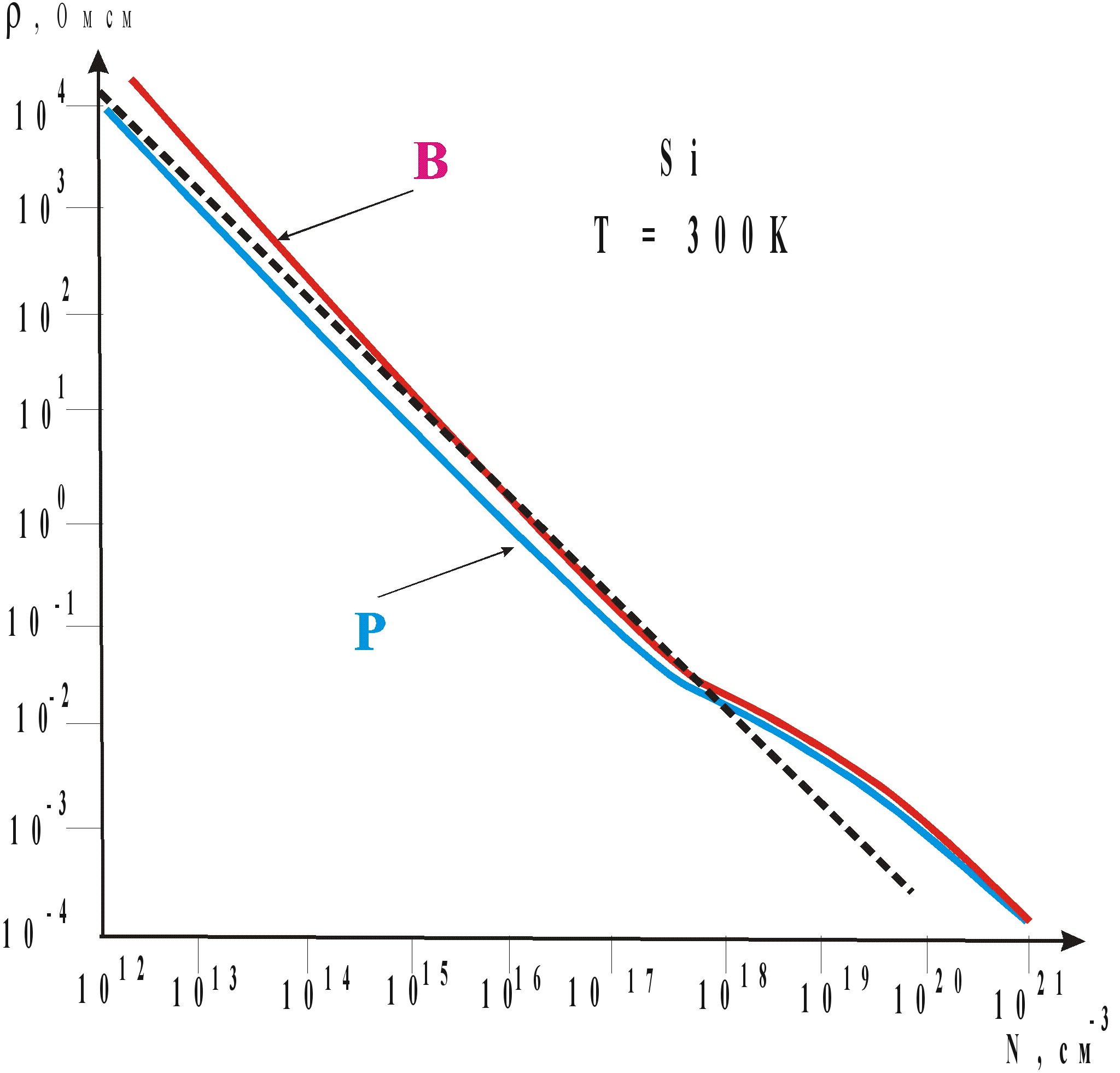 Изменение электропроводности может быть связано изменением концентрации носителей заряда и их скорости. Как показали эксперименты в большинстве случаев в полупроводниках основным фактором является изменение концентрации носителей заряда. Особенно сильно концентрация носителей заряда зависит от концентрации введенной примеси (обычно говорят от степени легирования). На рис. 1.3 показана измеренная на образцах кремния, легированных примесью фосфора или бора, зависимость удельного сопротивления кремния ρ = 1/σ от концентрации примеси. Из графика видно, что путем введения примеси проводимость полупроводника действительно можно изменять вплоть до проводимости близкой к металлической σ ≈ 104 (ρ ≈ 10-4).