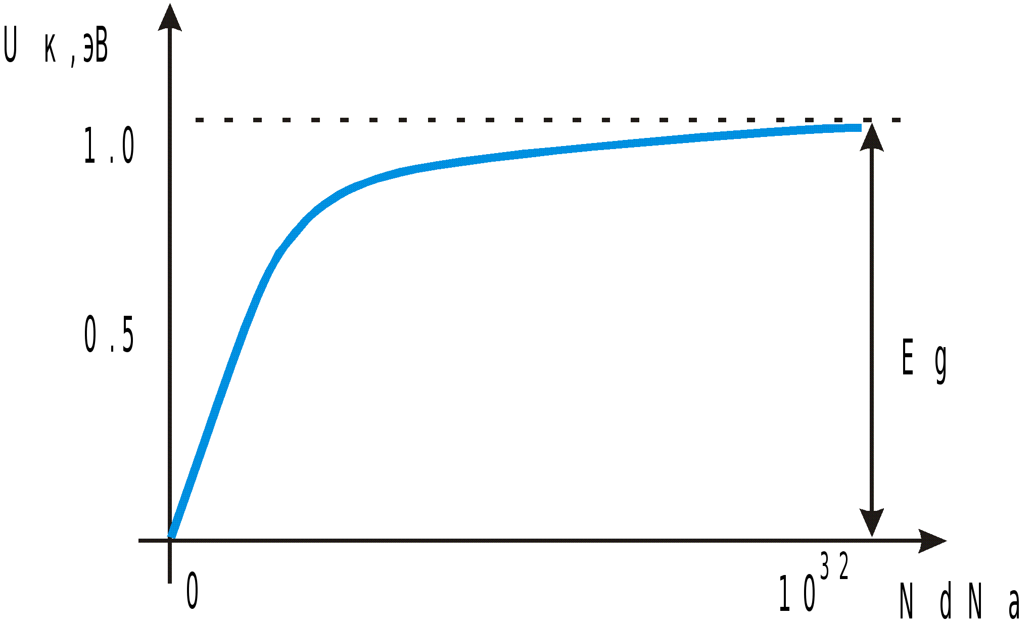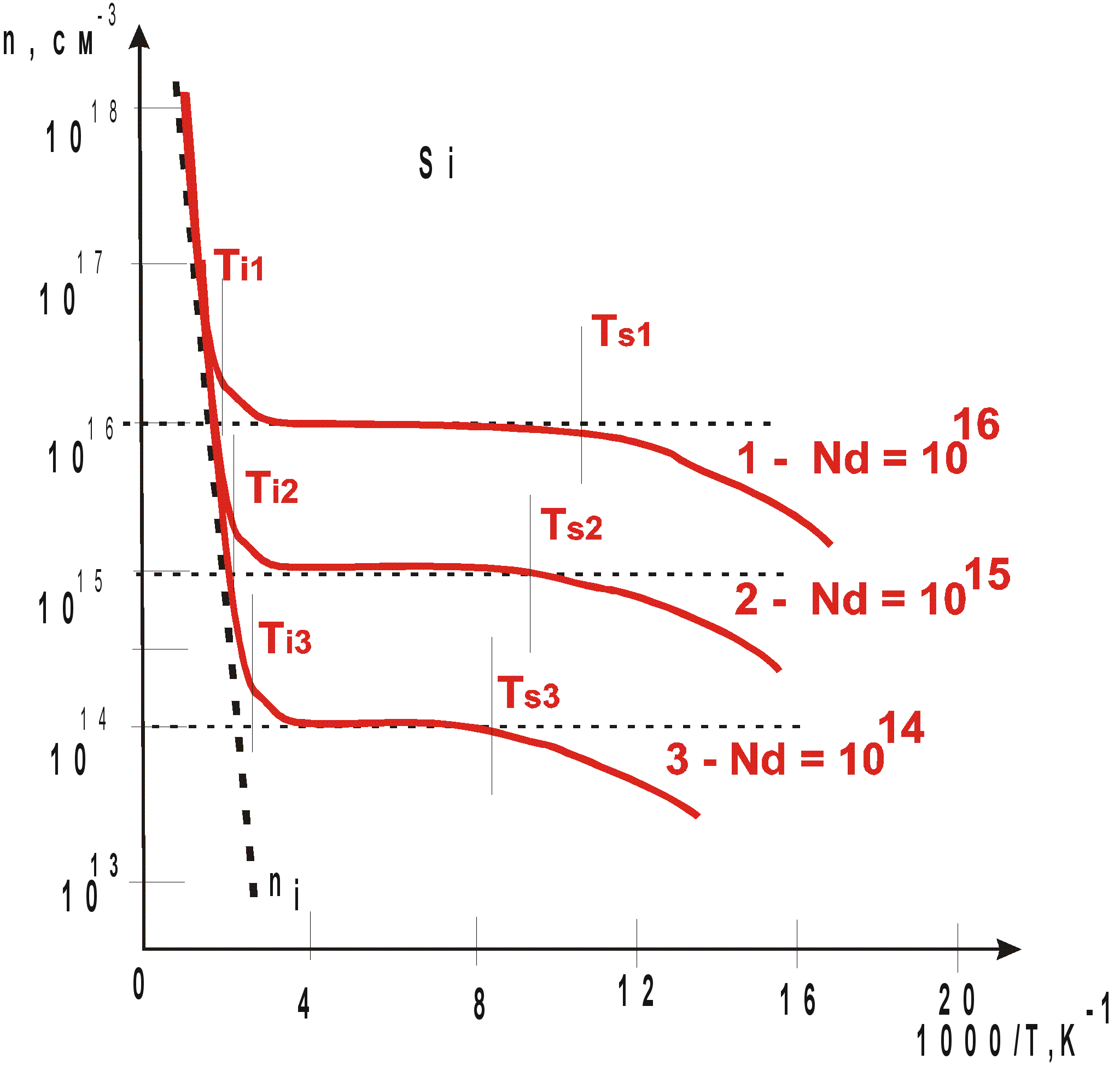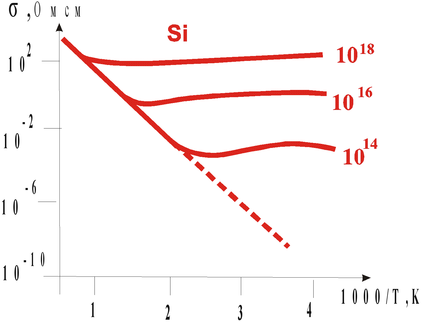Следует обратить внимание на тот факт, что при увеличении концентрации примеси на 9 порядков, проводимость образца возрастает на 8 порядков, т.е. существует почти линейная зависимость между проводимостью и концентрацией примеси.