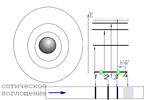 Рис. 1.5. Диаграмма, иллюстрирующая энергетический спектр электронов в атоме (модель Бора) и ожидаемый спектр поглощения.