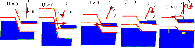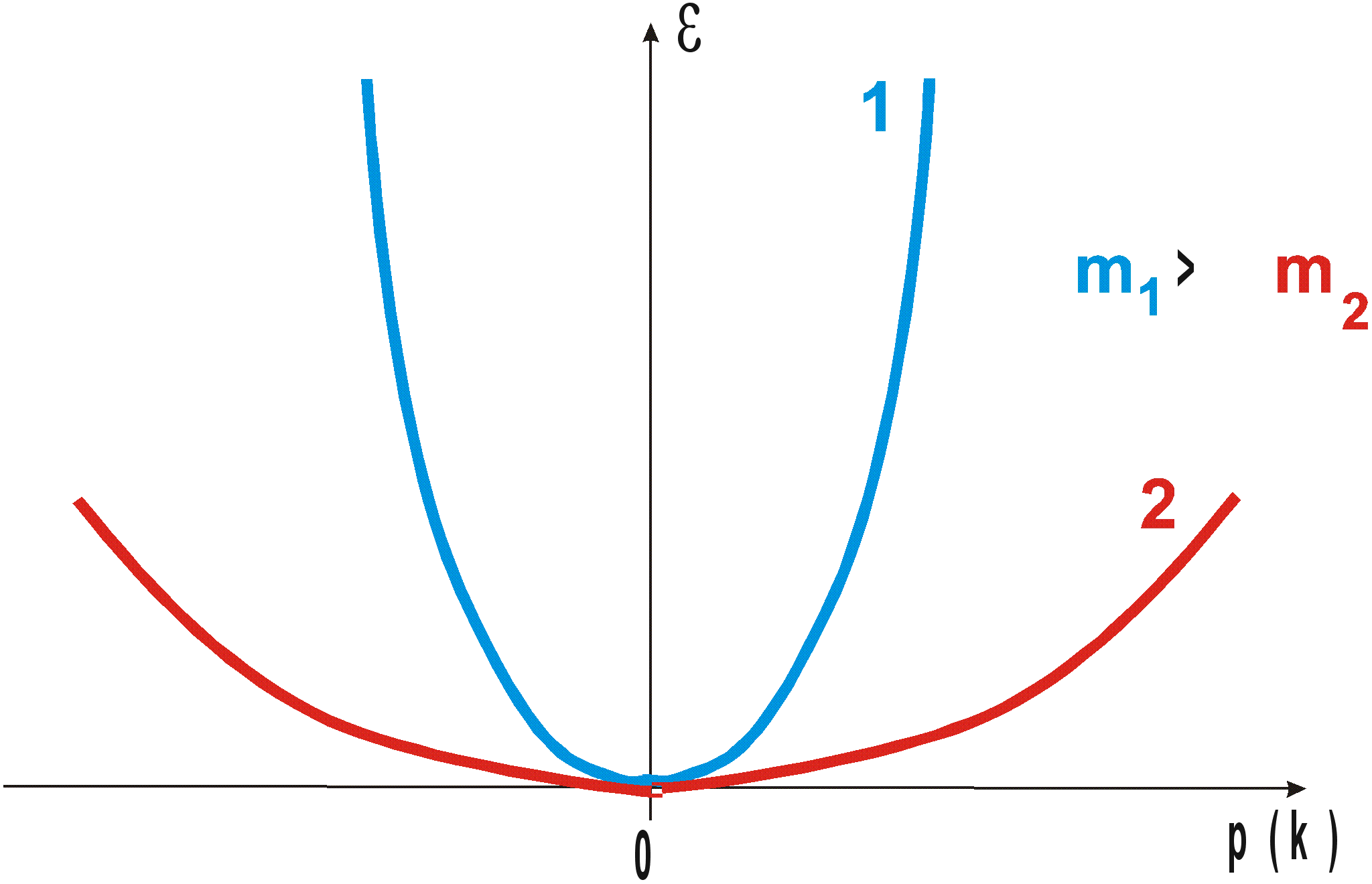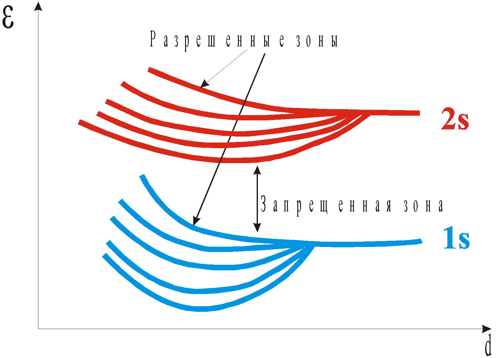 На рис. 1.6. показана схема расщепления уровней для пяти атомов при уменьшении расстояния между ними. Как видно из графиков при образовании между атомами связей валентные электроны формируют разрешенные для электронов зоны, причем число состояний в этих зонах тем больше, чем больше взаимодействующих атомов. В кристаллах число атомов более чем 1022 см-3, примерно такое же количество уровней в зонах. При этом расстояние между уровнями становится чрезвычайно малым, что позволяет считать, что энергия в разрешенной зоне изменяется непрерывно. Тогда электрон, попавший в незанятую зону можно рассматривать как классический, считая, что под действием электрического поля он набирает непрерывно энергию, а не квантами, т.е. ведет себя как классическая частица.