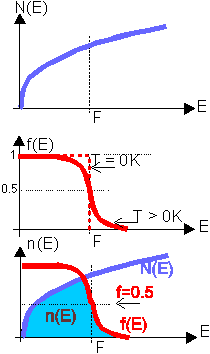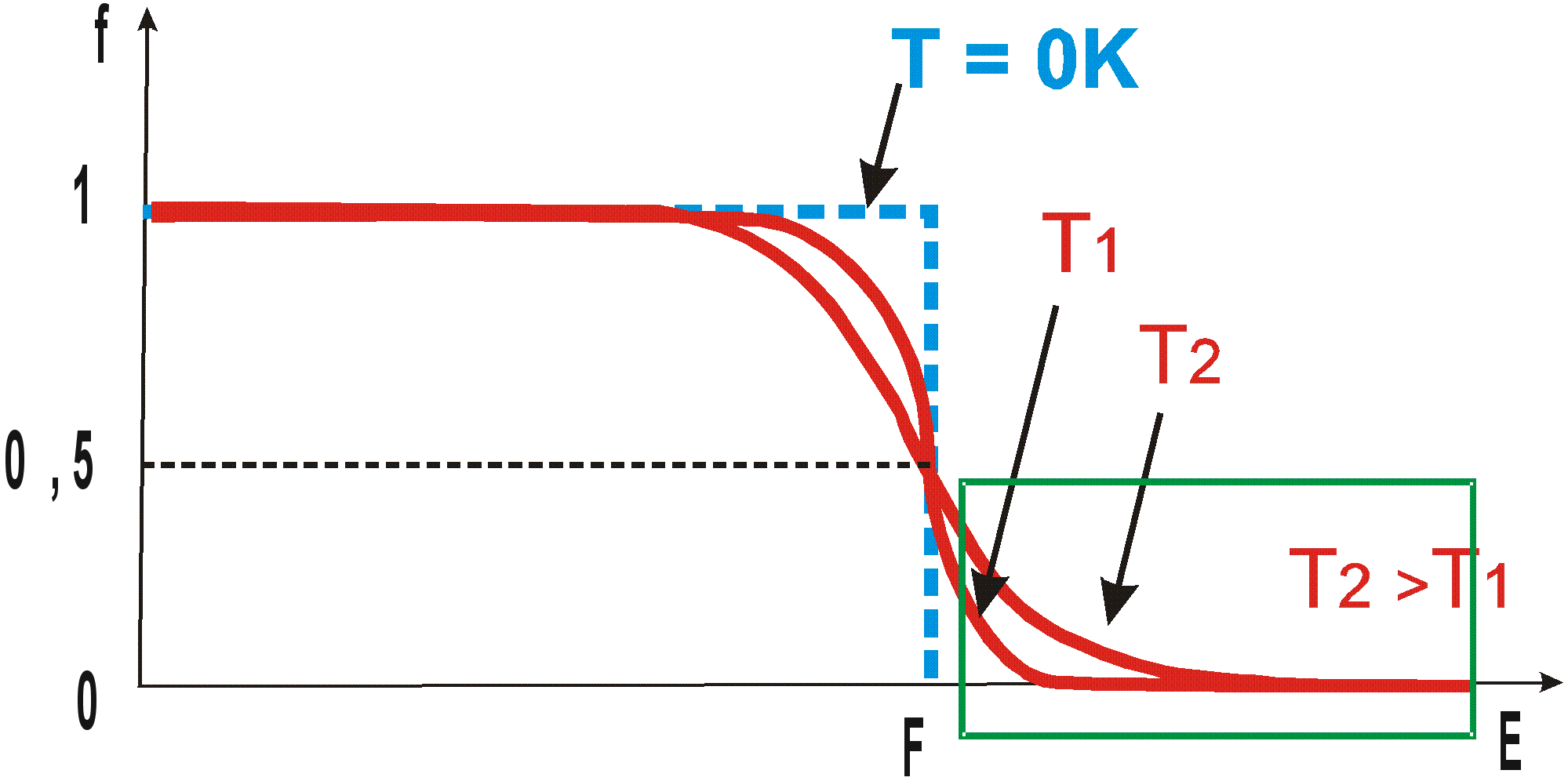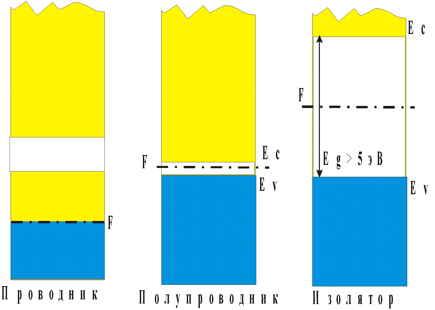 Для проводников разрешенная зона частично заполнена электронами, поэтому даже при приложении внешнего напряжения они способны набирать энергию и перемещаться по кристаллу. Такая структура зон характерна для металлов. Уровень F, разделяющий заполненную электронами и незаполненную часть зоны называют уровнем Ферми. Формально его определяют как уровень вероятность заполнения которого электронами равна 1/2.