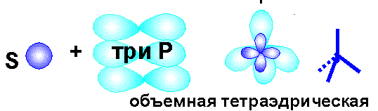 Элементы четвертой групп используют четыре электрона находящихся в s и p орбиталях, но в разных электронных оболочках (N изменяется от 2 для С до 6 для Pb). При взаимодействии образуется гибридная sp3 орбиталь) в ее образовании участвует одна s орбиталь и 3p – орбитали). Эта орбиталь состоит из гибридизированных четырех орбиталей каждая из которых с учетом спина может принять четыре электрона и таким образом образуется заполненная внешняя оболочка с восьмью электронами. При этом атом может образовывать химические связи с четырьмя соседями, т.е. является четырежды координированными. Все связи эквивалентны и образуют тетраэдрическую решетку (тетраэдр – фигура с четырьмя одинаковыми поверхностями). Схема образования гибридной sp3 орбитали показана на рис. 1.8.