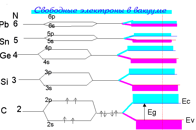 Рис. 1.9. Схема образования зон элементарных полупроводников четвертой группы периодической системы элементов.