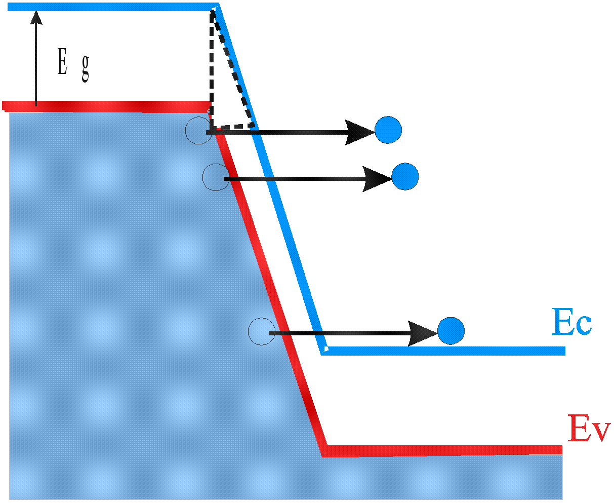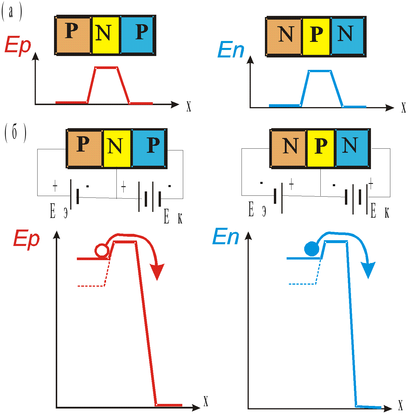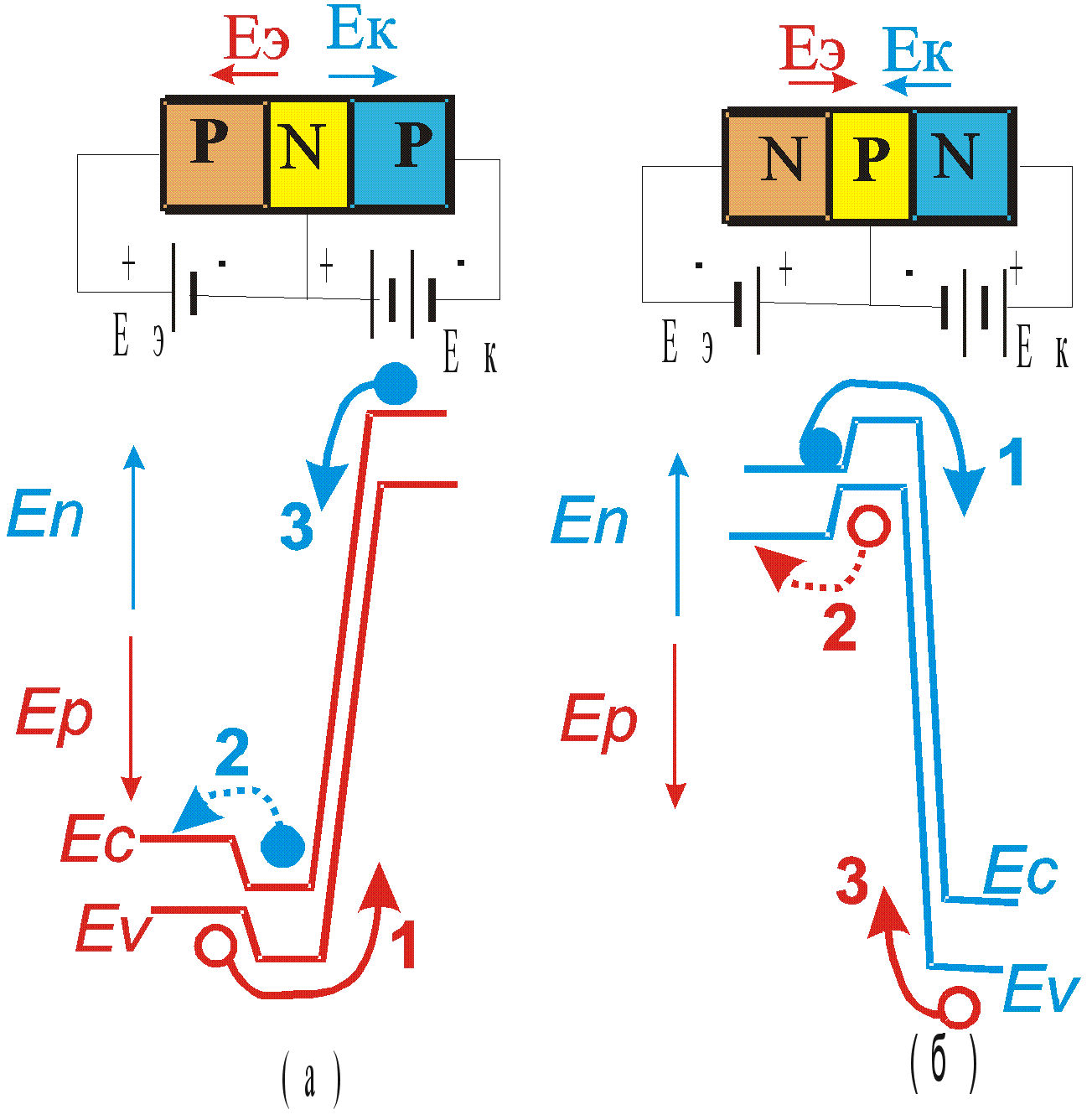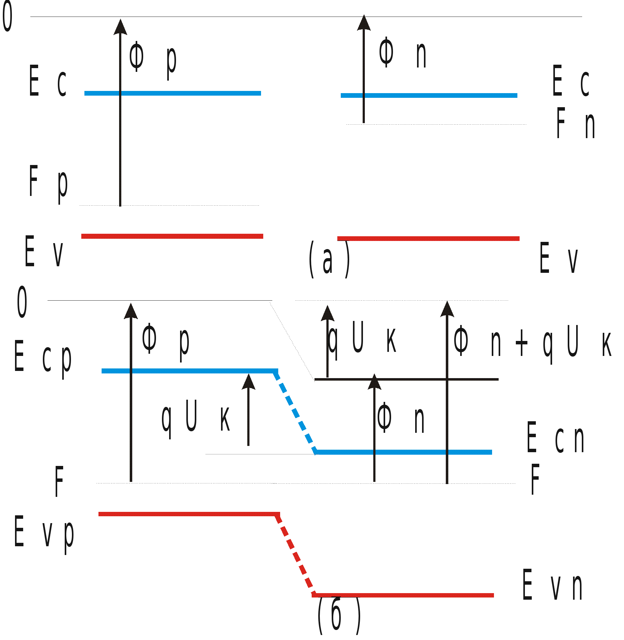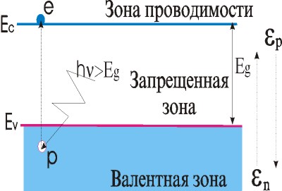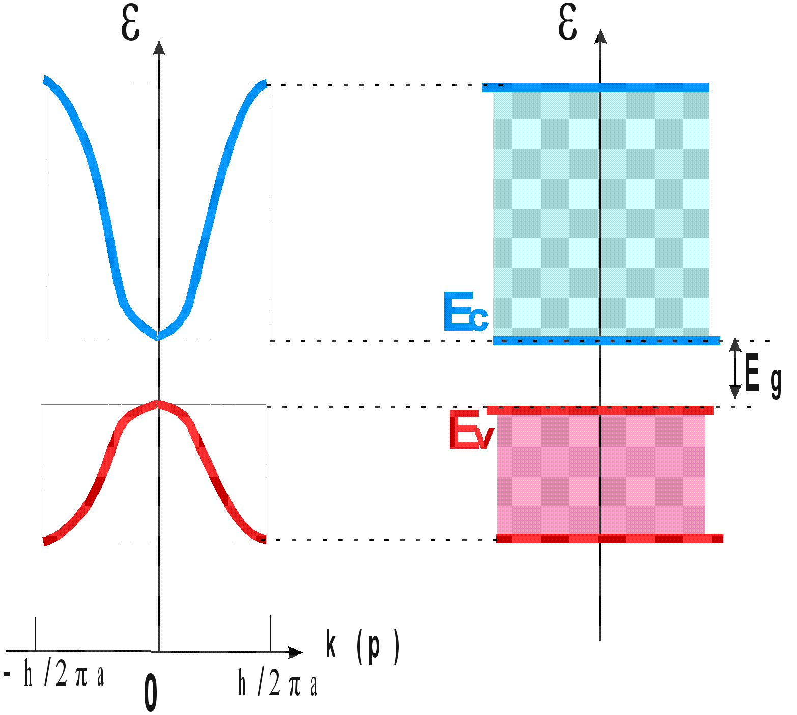 Для полупроводников и диэлектриков структура зон такова, что нижняя разрешенная зона полностью заполнена валентными электронами, поэтому ее называют валентной. Потолок валентной зоны обозначают Ev. В ней электроны перемещаться под действием поля (и соответственно набирать энергию) не могут, поскольку все энергетические уровни заняты, а согласно принципу Паули электрон не может переходить с занятого состояния на занятое. Поэтому электроны в полностью заполненной валентной зоны не участвуют в создании электропроводности. Верхняя зона в полупроводниках и диэлектриках в отсутствии внешнего возбуждения свободна от электронов и если каким либо образом туда забросить электрон, то под действием электрического поля он может создавать электропроводность, поэтому эту зону называют зоной проводимости. Дно зоны проводимости принято обозначать Ec. Между зоной проводимости и валентной зоной находится запрещенная зона Eg, в которой согласно законам квантовой механики электроны находиться не могут (подобно тому как электроны в атоме не могут иметь энергии не соответствующие энергиям электронных оболочек). Для ширины запрещенной зоны можно записать: