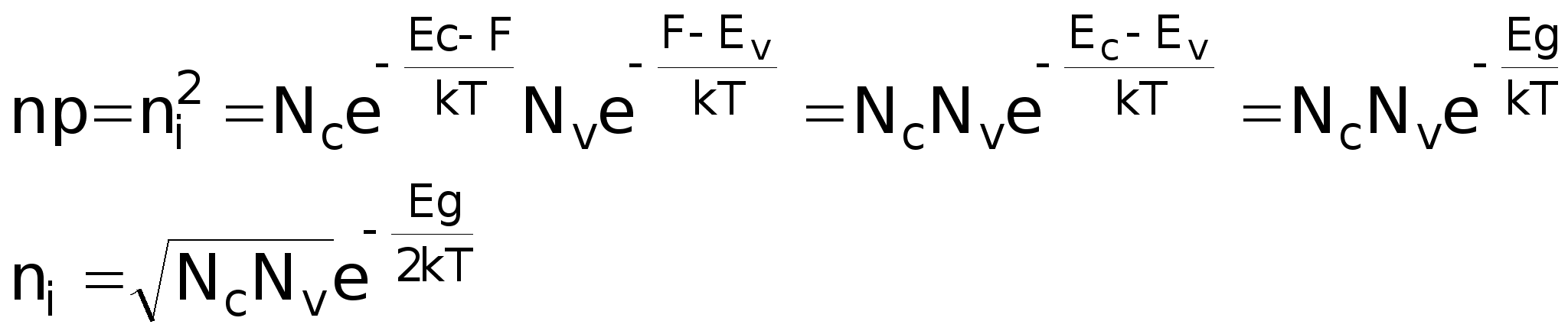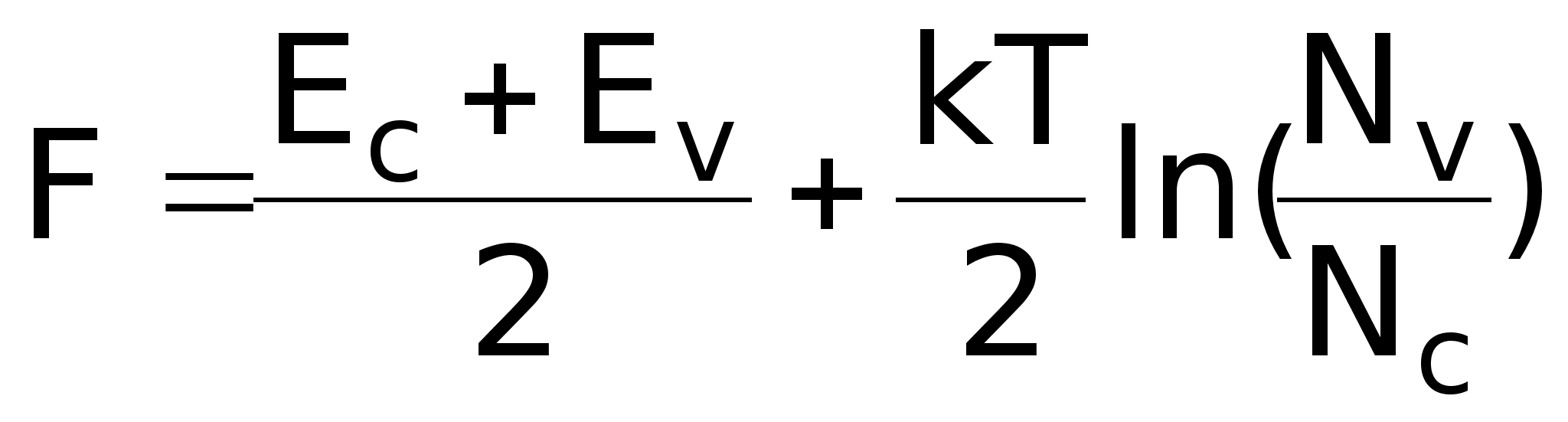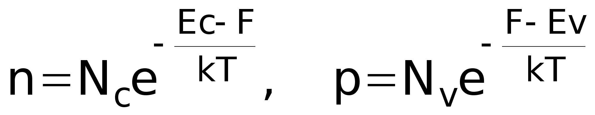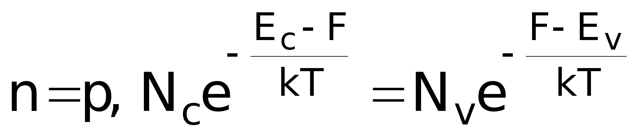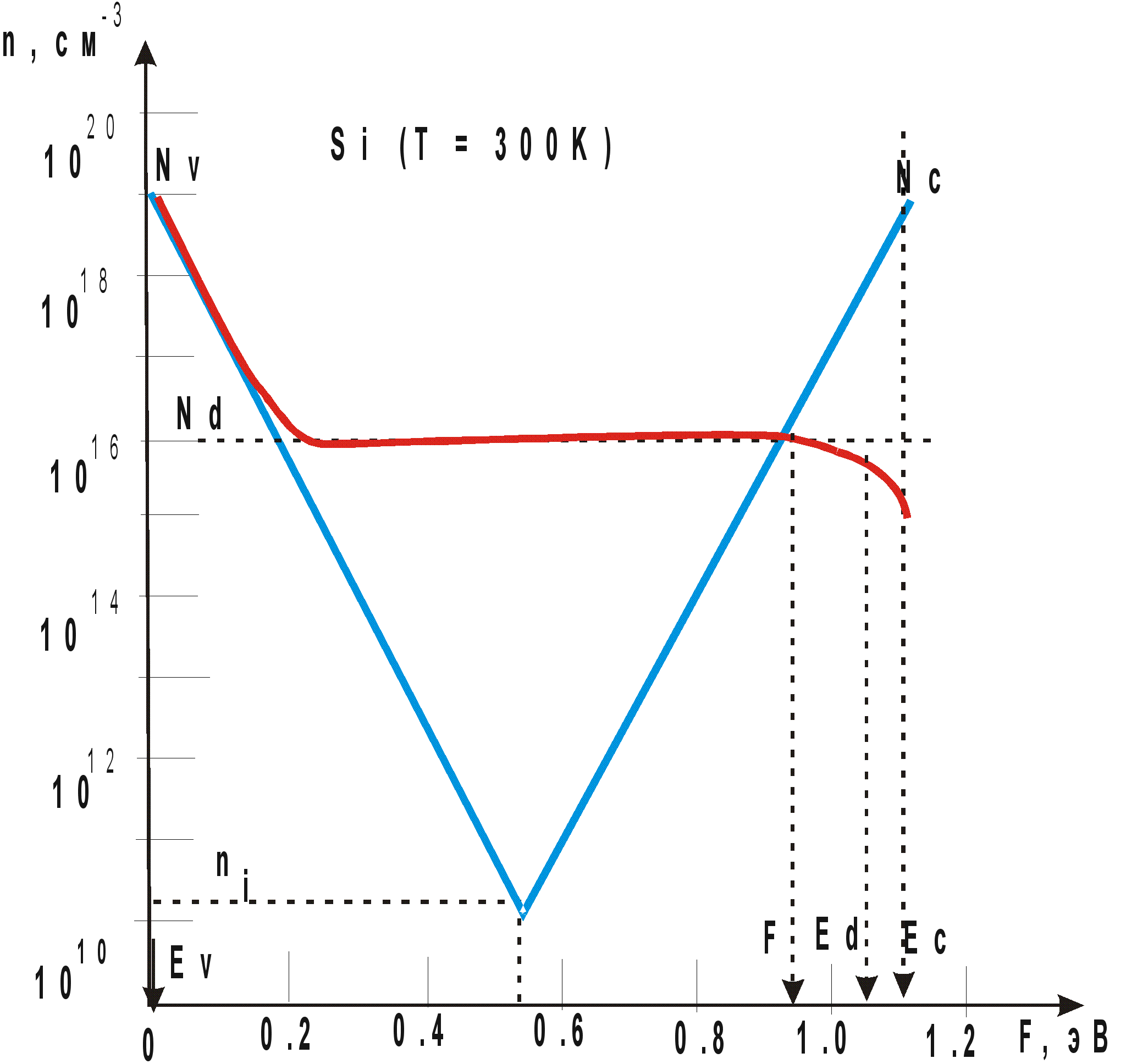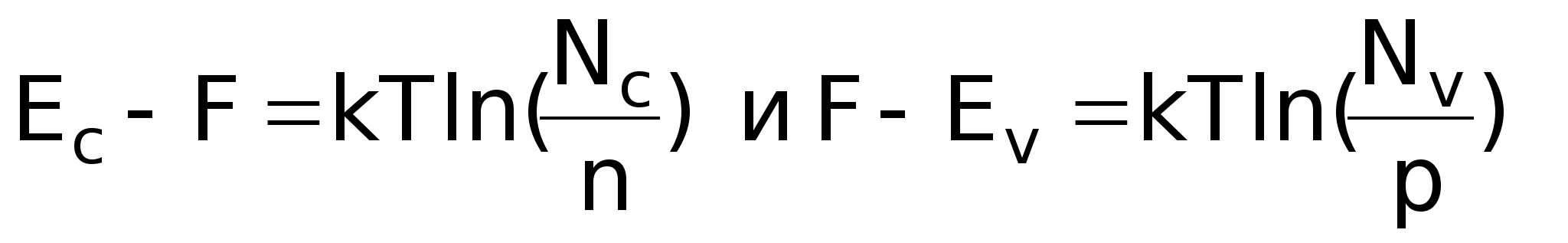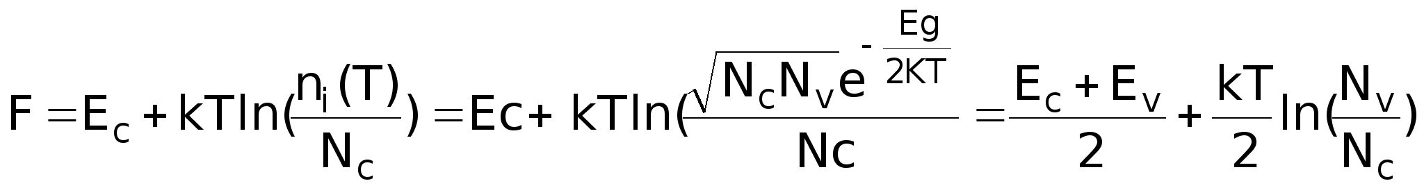 Поскольку в отсутствии внешнего возбуждения валентная зона полностью заполнена (вероятность нахождения электрона на Ev = 1), зона проводимости полностью свободна (вероятность нахождения электрона на Eс = 0), то формально уровень Ферми с вероятностью заполнения Ѕ должен был бы находиться в запрещенной зоне. Расчеты показывают, что действительно в беспримесных бездефектных полупроводниках и диэлектриках (их принято называть собственными) он лежит вблизи середины запрещенной зоны. Однако электроны там находится не могут, поскольку там нет разрешенных энергетических уровней.