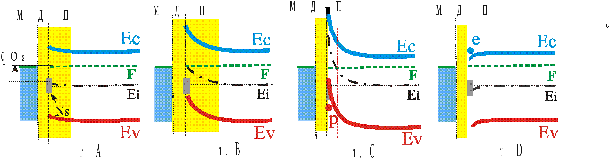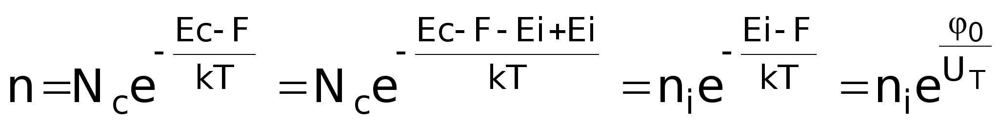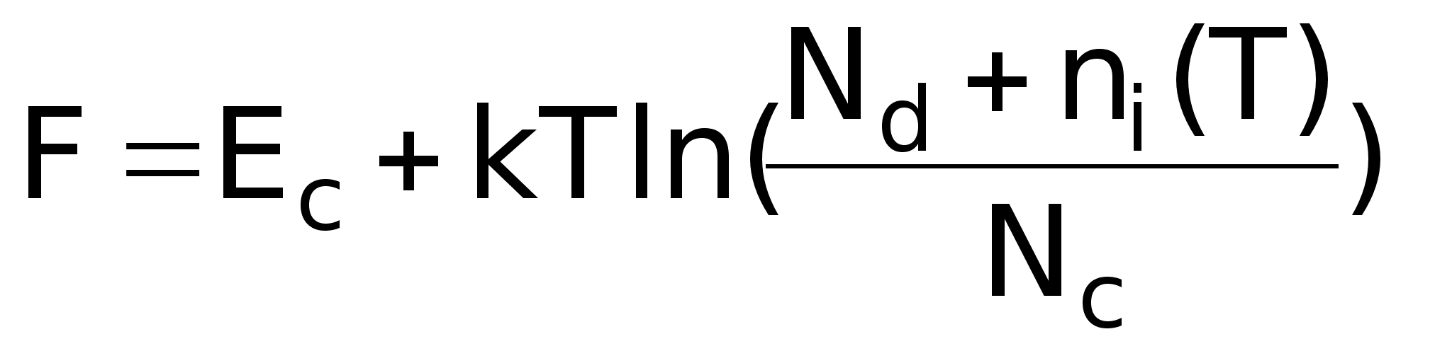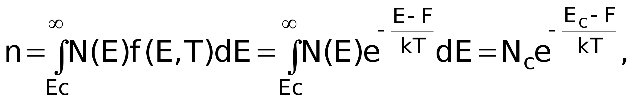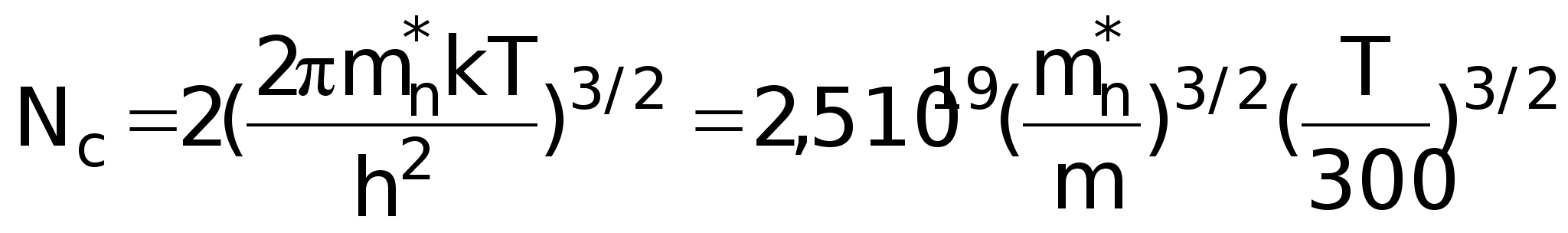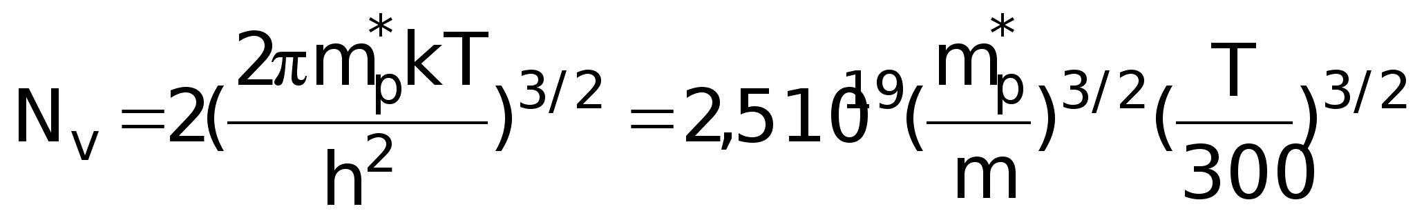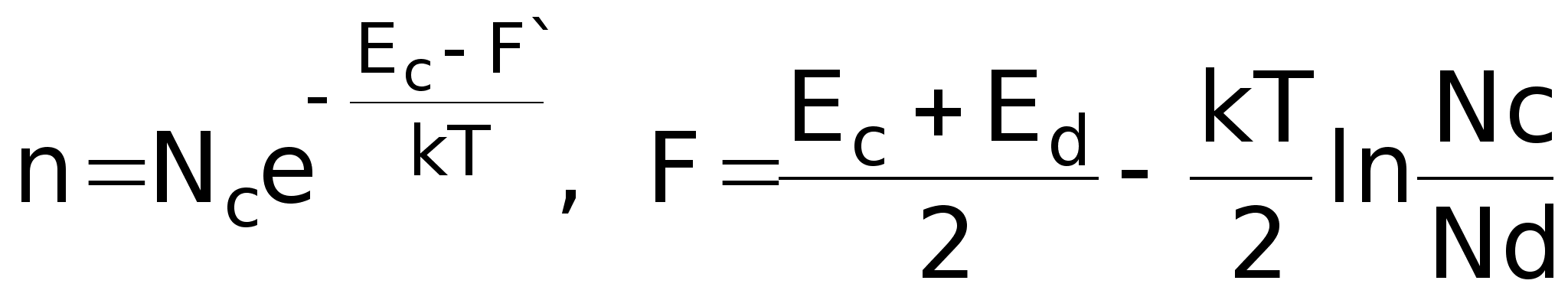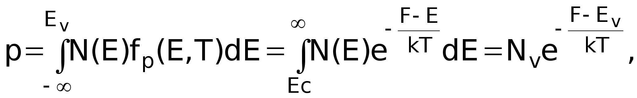 Поскольку в отсутствии внешнего возбуждения валентная зона полностью заполнена (вероятность нахождения электрона на Ev = 1), зона проводимости полностью свободна (вероятность нахождения электрона на Eс = 0), то формально уровень Ферми с вероятностью заполнения Ѕ должен был бы находиться в запрещенной зоне. Расчеты показывают, что действительно в беспримесных бездефектных полупроводниках и диэлектриках (их принято называть собственными) он лежит вблизи середины запрещенной зоны. Однако электроны там находится не могут, поскольку там нет разрешенных энергетических уровней.
