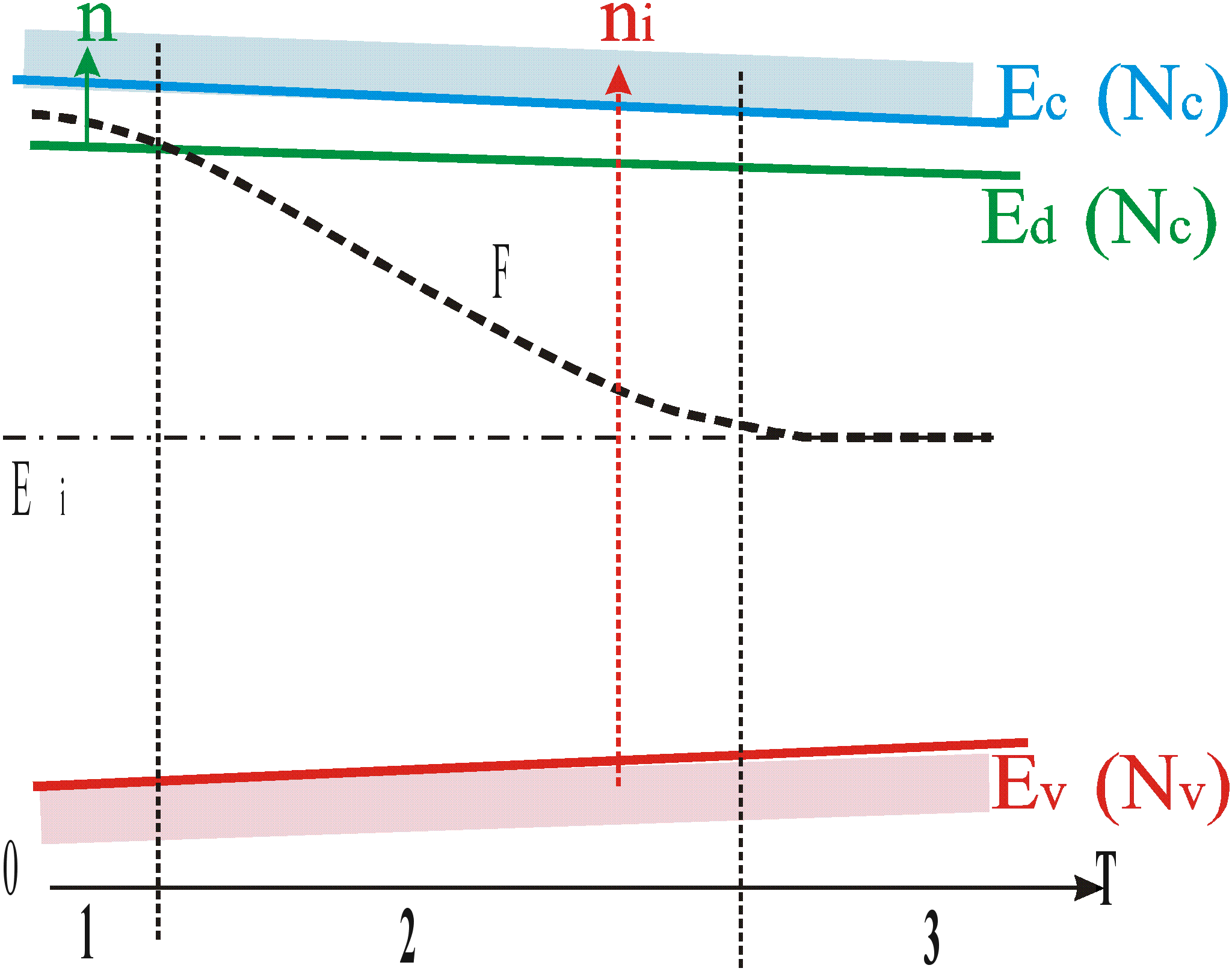 Легирование влияет не только на величину электропроводности, но и на ее температурную зависимость, что демонстрируют кривые, приведенные на рис. 3.4. Как видно из графиков в области высоких температур электропроводность легированного материала стремится к электропроводности нелегированного. В области низких температур проводимость изменяется незначительно, имея слабо выраженный максимум. Для сильно легированных кристаллов проводимость изменяется с температурой подобно проводимости металлов.