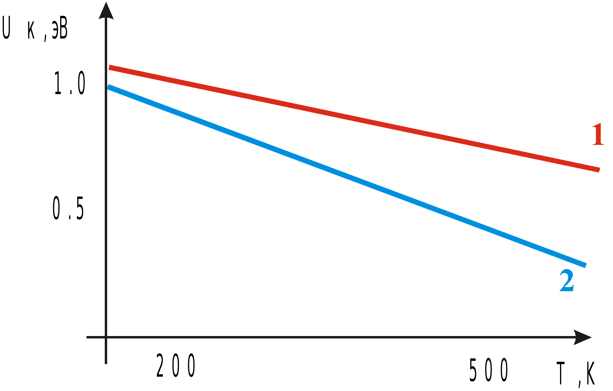 Рис. 1.2. Влияние освещения на температурную зависимость электропроводности: 1 – зависимость измеренная в темное, 2 – на свету.