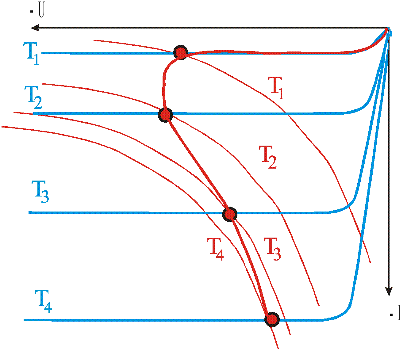 На следующем рисунке показана зависимость электропроводности собственного кремния от температуры при освещении его солнечным светом, подтверждающая сильное влияние внешних воздействий на свойства полупроводников.