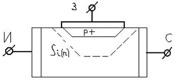 В МДП - транзисторах со встроенным каналом проводящий канал, изготавливается технологическим путем, образуется при напряжении на затворе равном нулю. Током стока можно управлять, изменяя значение и полярность напряжения между затвором и истоком. При некотором положительном напряжении затвор - исток транзистора с р - каналом или отрицательном напряжении транзистора с n - каналом ток в цепи стока прекращается. Это напряжение называют напряжением отсечки (UЗИ.отс ). МДП - транзистор со встроенным каналом может работать как в режиме обогащения, так и в режиме обеднения канала основными носителями заряда.