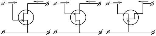 Полевой транзистор в качестве элемента схемы представляет собой активный несимметричный четырехполюсник, у которого один из зажимов является общим для цепей входа и выхода. В зависимости от того, какой из электродов полевого транзистора подключен к общему выводу, различают схемы: с общим истоком и входом затвор; с общим стоком и входом на затвор; с общим затвором и входом на исток. Схемы включения полевого транзистора показаны на рис. 3.