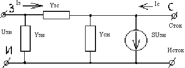 Эквивалентная схема полевого транзистора, элементы которой выражены через у-параметры, приведен на рис. 4. При таком подключении каждая из проводимости имеет физический смысл.
