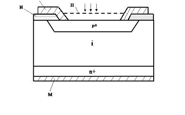 при наличии обратного смещения, созданного внешней электрической цепью создает обедненную область, в которой отсутствуют носители и действует сильное электрическое поле. Эта область образована неподвижными положительно заряженными атомами донора в n-области и неподвижными отрицательно заряженными атомами акцептора в p-области. Если теперь осветить фотодиод, то возникшие носители (электроны и дырки) ускоряются в этом поле и движутся в n-слой (электроны) и в p-слой (дырки). Так фотодиод отрабатывает световые сигналы. Ширина обедненной области зависит от концентрации примесей и величины напряжения смещения. Чем меньше примесей, тем шире обедненная область. Положение и ширина поглощающей области зависят от длины волны падающего света и от материала фотодиода. Чем сильнее поглощается свет, тем тоньше поглощающая область. Ширину обедненного слоя можно увеличить, повысив напряжение смещения, но в таком обедненном слое очень слабое по напряженности поле. Для устранения этого недостатка была создана p-i-n-структура фотодиода. В такой структуре между p- и n- слоями помещен слой полупроводника с высоким сопротивлением и толщиной в несколько десятков микрометров. В таком фотодиоде свет падает на i-слой и носители ускоряются сильным полем в этом слое. Это понижает инертность и повышает частоту преобразования до нескольких гигагерц. Для повышения чувствительности увеличивают светопоглощающую поверхность, а для понижения емкости перехода повышают напряжение обратного смещения.