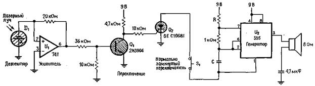 б) Острая направленность светового излучения, обусловленная тем, что угловая расходимость луча пропорциональна длине волны и может быть меньше одной минуты. Это позволяет концентрированно и с малыми потерями передавать электромагнитную энергию в заданную область пространства. В малогабаритных электронных устройствах лазерный луч может быть направлен на фоточувствительные площадки микронных размеров.