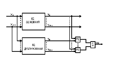 На входы X0-Xn-1 приходят сигналы, которые подаются на: основную и дублирующую схемы. Далее выходные сигналы Y0-Ym-1 анализируются в блоках M2. Завершающем этапом является логические операции в логическом блоке,